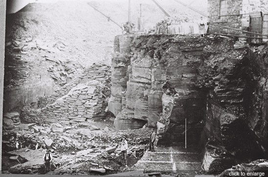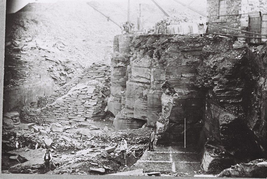 Once the overburden of clay and soft rock had been removed to expose the beds of Haslingden Flag, the rock-getters took over. Working on the flat top surface of the bed, they would first mark out the extent of the block to be broken free. Rows of tapered holes were then cut along the marks and wedges hammered into the holes to split the rock, allowing the block to be prised free with crowbars.